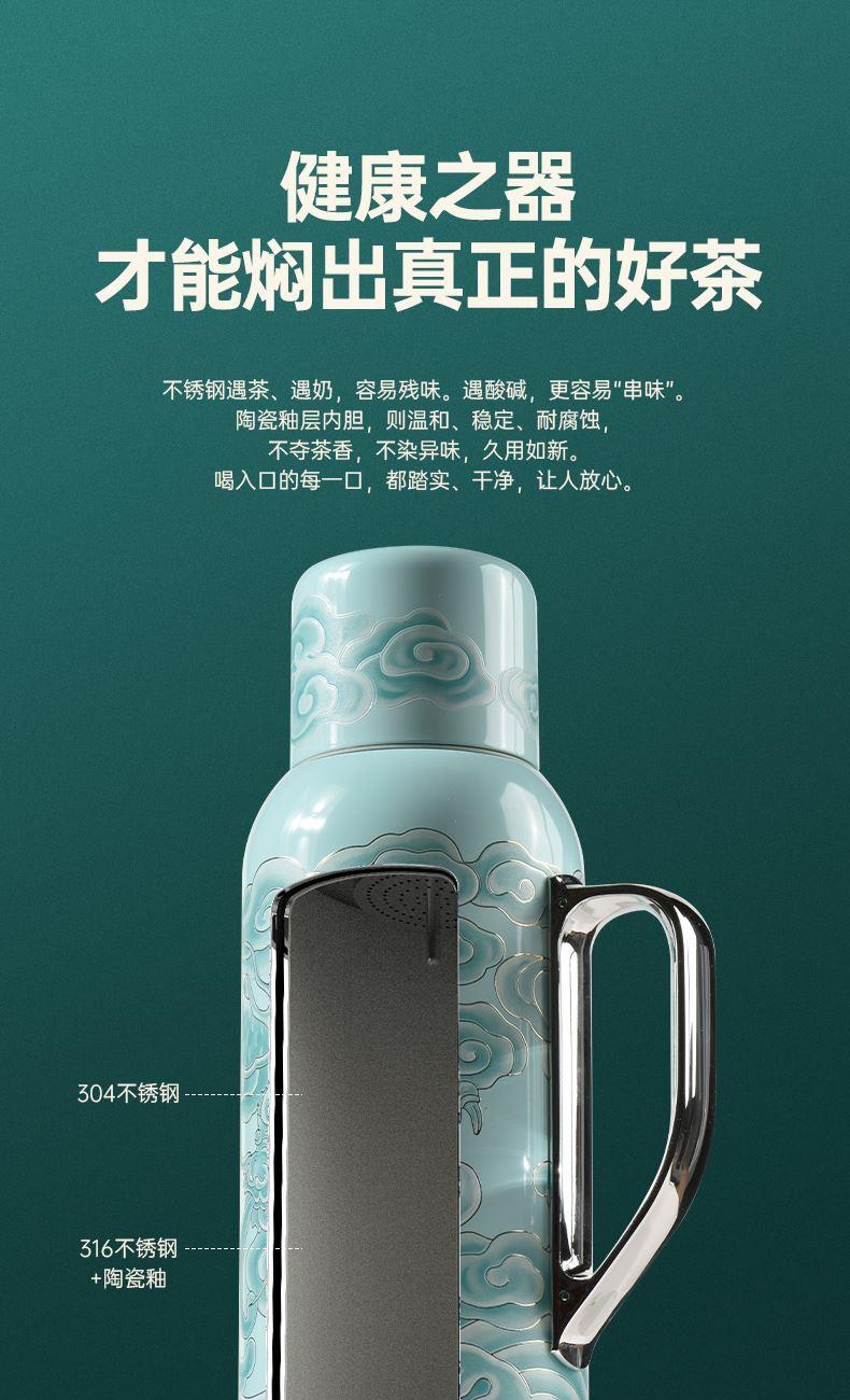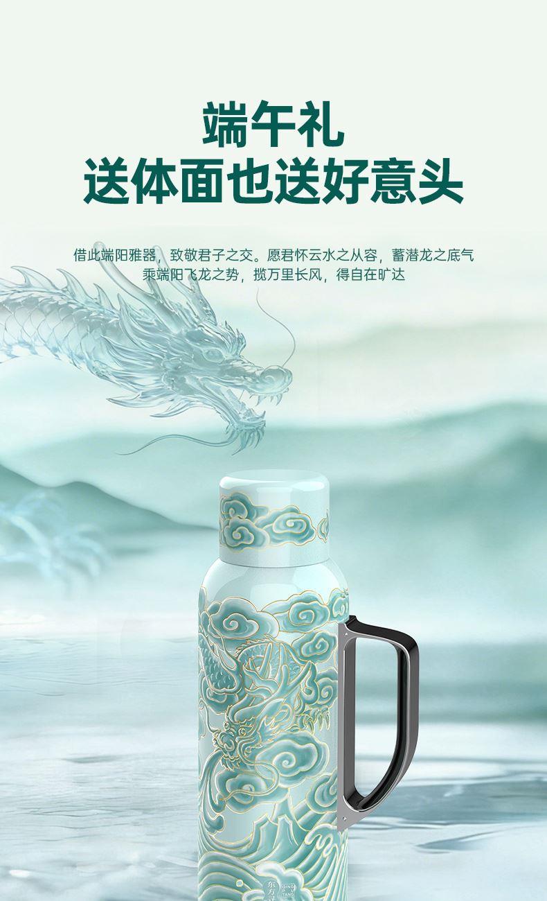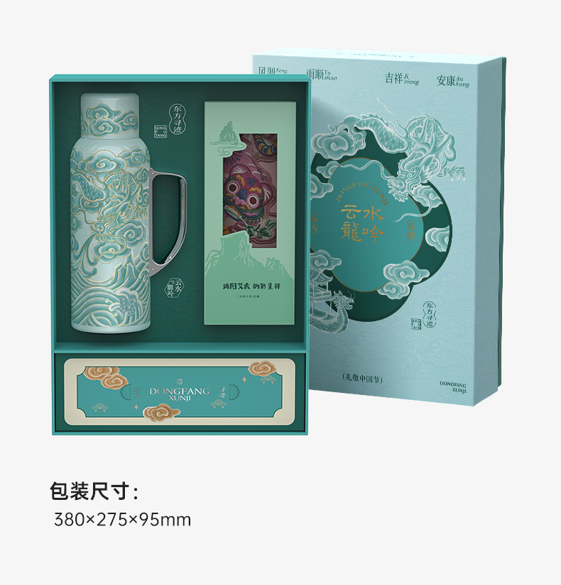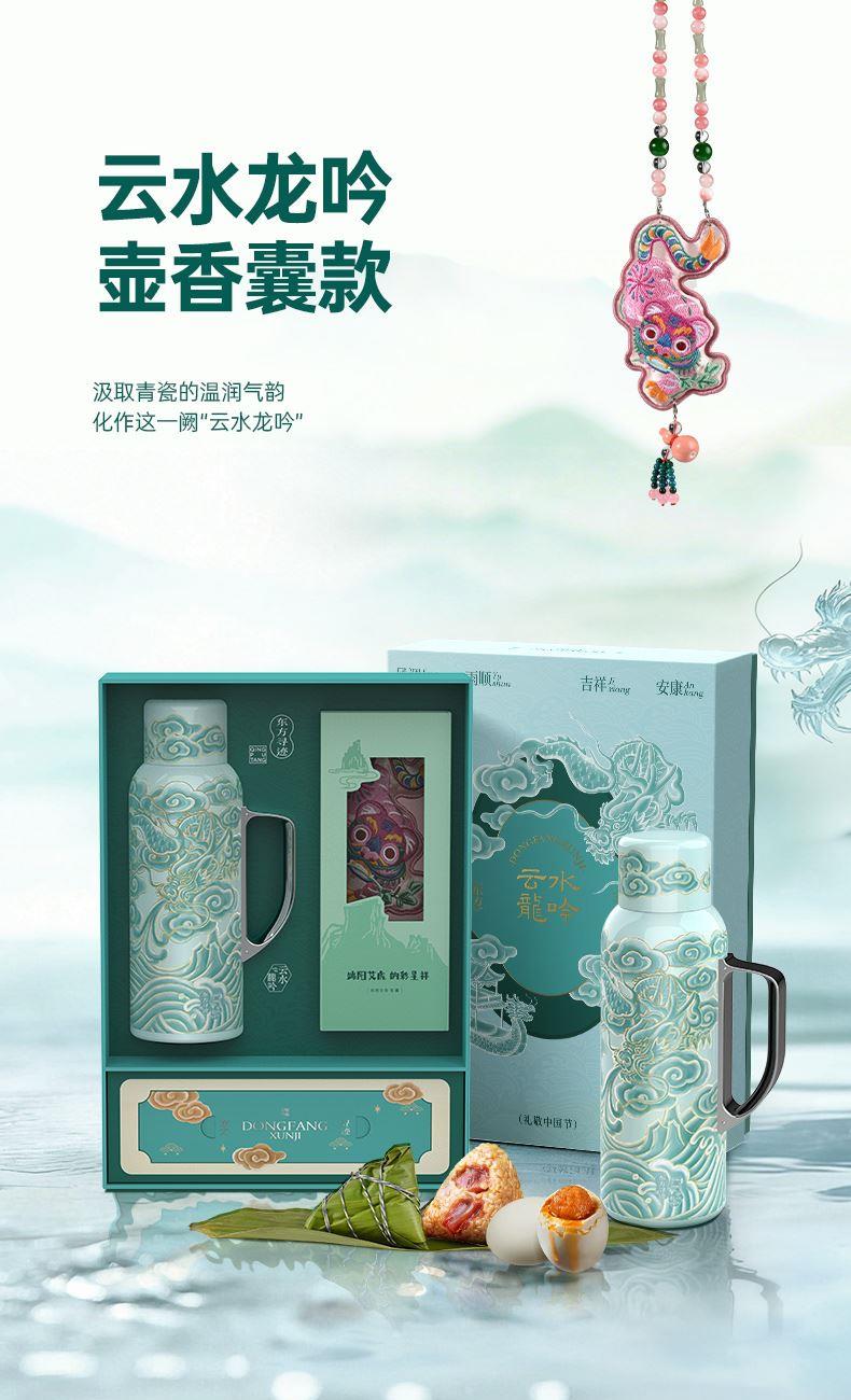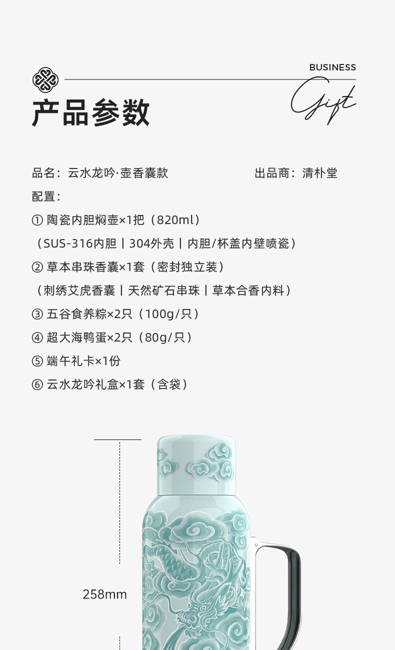 配置 · ① 陶瓷内胆焖壶×1把(820ml) (SUS-316内胆丨304外壳丨内胆/杯盖内壁喷瓷) ② 草本串珠香囊×1套(密封独立装) (刺绣艾虎香囊丨天然矿石串珠丨草本合香内料) ③ 发芽糙米粽×2只(100g/只) ④ 超大海鸭蛋×2只(80g/只) ⑤ 端午礼卡×1份 ⑥ 云水龙吟礼盒×1套(含袋) 尺寸 · 380×275×95mm