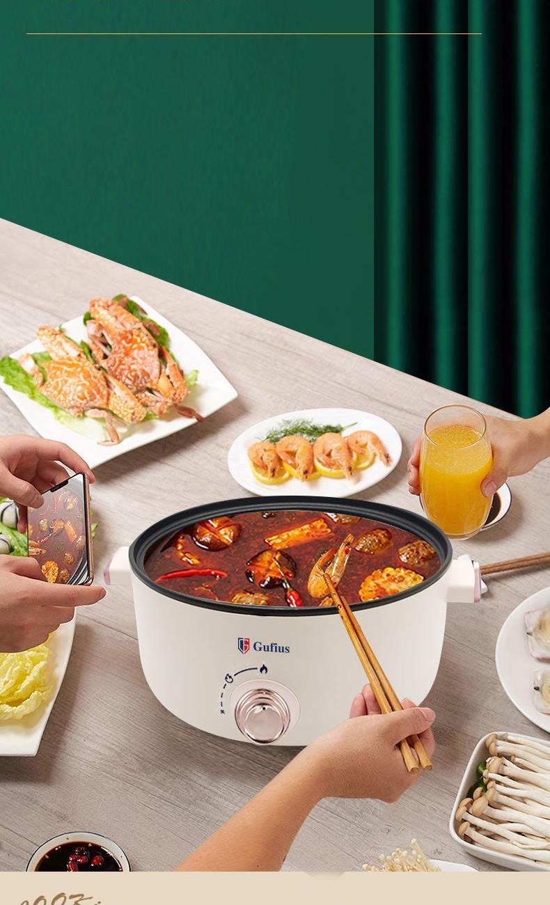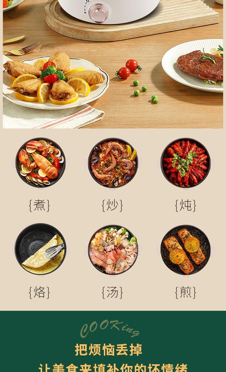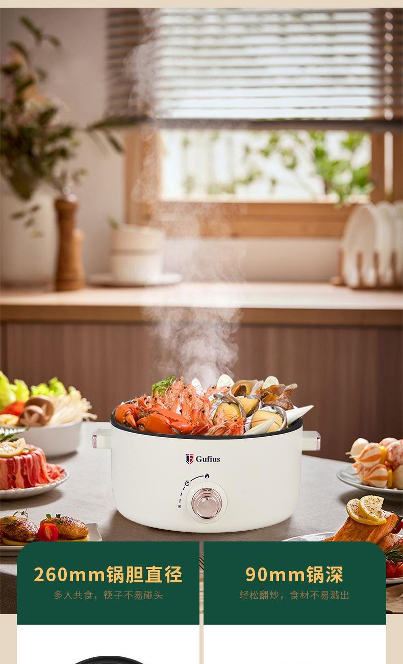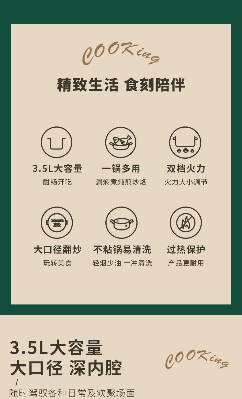 1、多功能烹饪于一锅,涮、焖、煮、炖、煎、炒、烙。 2、3.5L大容量,大口径,深内腔,玩转美食,酣畅开吃。 3、1000W大功率,加热面积更大,受热更均匀,聚餐时刻更尽兴。 4、双档火力调节,操作简单,快速升温,轻松拿捏食物火候。 5、食物级防沾涂层,有效控制油烟,避免糊底,易清洗一抹就净。 6、过热保护,高温制停,自动断电降温,烹饪更安心